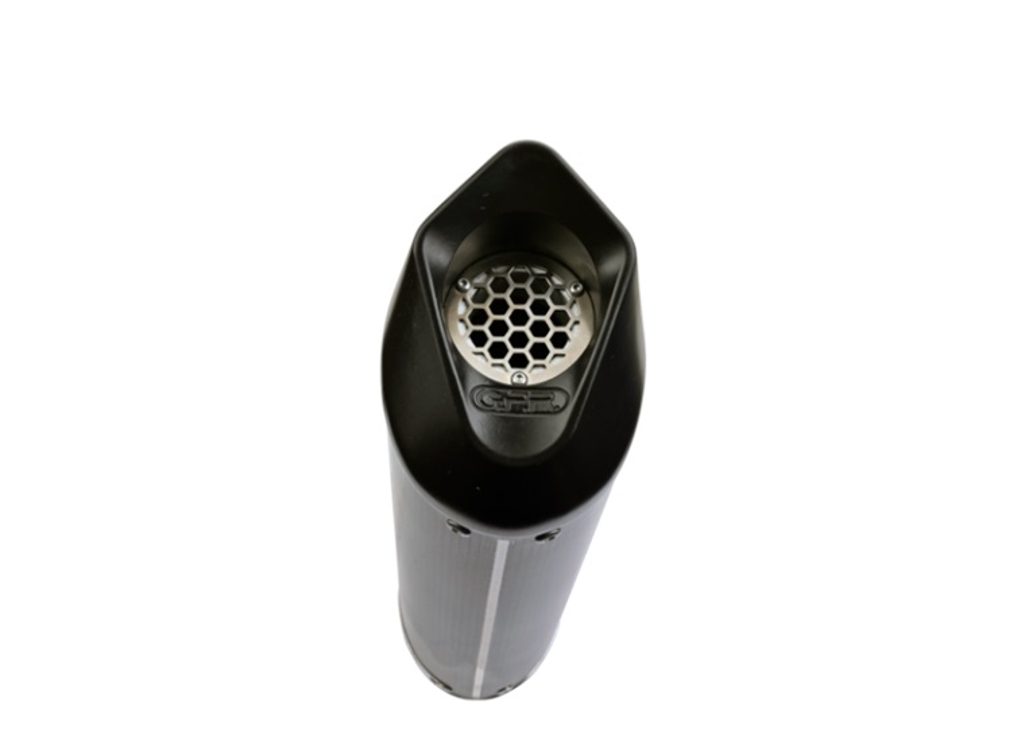 GPR's Furore Poppy silencer has a carbon look, stainless body and has been developed with a production process that produces zero impact to the environment. It has an oval shape with a diameter of 120MM, with avional bottoms produced by CNC machining.