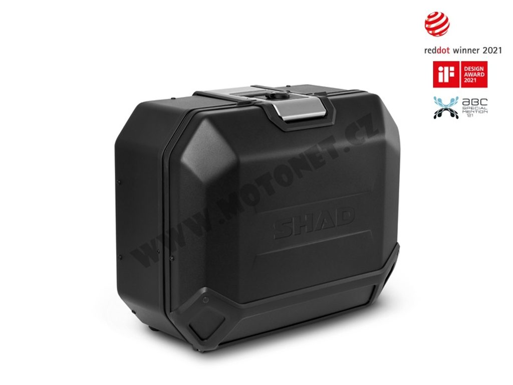 The complete set of SHAD TERRA BLACK aluminum side cases includes left and right black case TR36 with a capacity of 36L The set contains everything you need to mount both suitcases to the motorcycle.