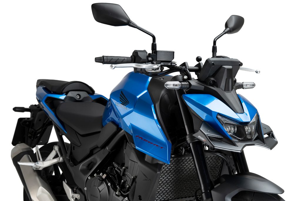 In the aerodynamic aspect, the new Naked front spoiler from Puig channels the air that reaches the radiator frontally and, thanks to its shapes, provides almost 2kg of downforce on the front wheel, generating, in turn, an anti-wheelie effect; anti-shimmie effect (greater stability at high speeds), more poise when braking and greater stability when changing direction.