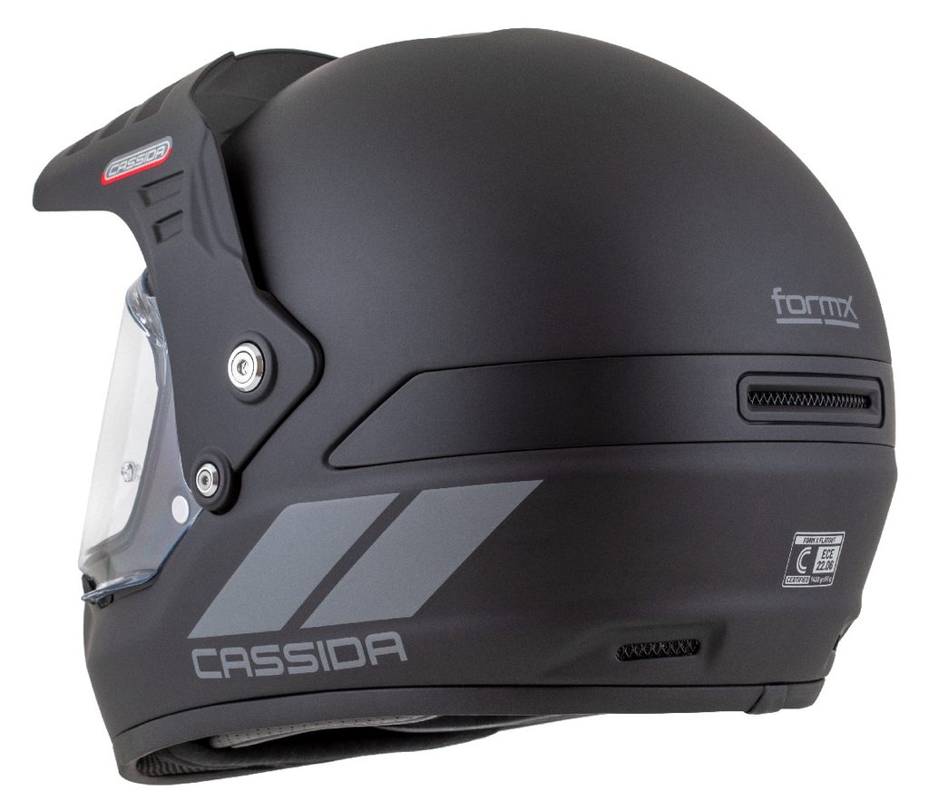 The FormX Helmet is a full-face helmet with a fiberglass shell and a removable peak. The ability to configure it either as a classic full-face helmet without the peak or with a peak and no visor makes it a highly versatile and stylish piece of protective gear.