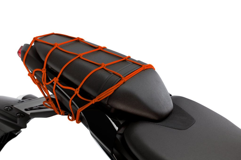 Orange elastic motorcycle net is the perfect accessory for punctual or usual load needs of a biker. Available in measures 350 mm x 350 mm, they are manufactured with a material of high elasticity and strength, which gives them a great capacity to adapt to the shapes of all types of packages and support a high weight. They have numerous metal hooks, lined in plastic material so as not to scratch the motorcycle, which allow the net to be fastened quickly and safely move objects in the back