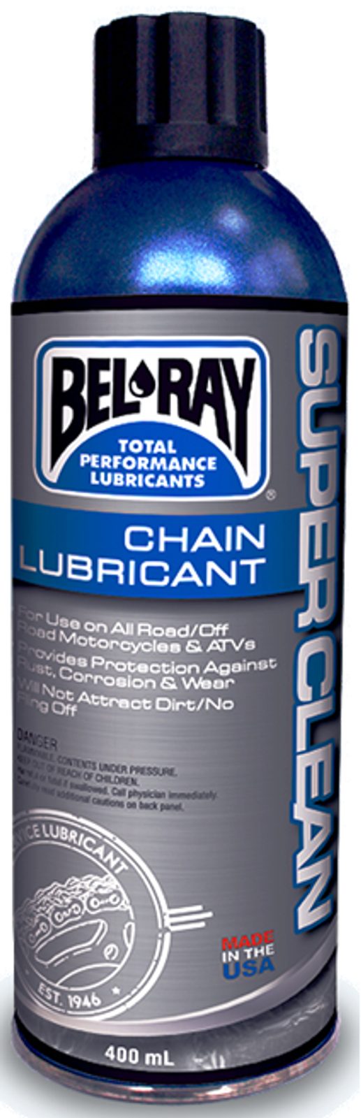 Bel-Ray Super Clean Chain Lube is an aerosol chain lube that utilizes the latest innovation in chain lubricant technology, combining unsurpassed anti-wear protection for long chain and sprocket life with an outer protective coating that will not attract dirt, sand, or grit and ABSOLUTELY WILL NOT FLING OFF when used as directed. Suitable for all ‘O’ ‘X’ and ‘Z’ ring and roller type chains for street, off-road, and racing use.