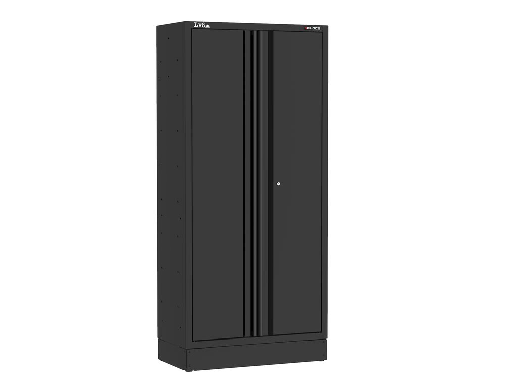 Two-door cupboard L. 900 mm with 4 height-adjustable and lockable shelves. Solid structure and black anodised aluminium handles. Can be integrated with our LV8 VELOCE workbenches.
